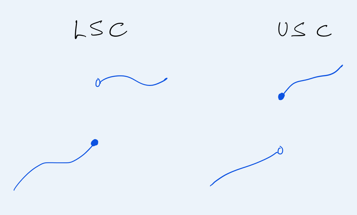 For example, take \(f\) the function \(f(x)=0\) for \(x \in [0,1]\) and \(f(x)=1\) otherwise. The points \(x=0,1\) are jumps, and the value jumps up. Approaching \(x\downarrow 1\) or \(x \uparrow 0\) there is no surprise jump—though obviously there is eventually! If \(x>1\) then \(f(x')=0\) for all \(x'\) near \(x\) and similarly for \(x<0\). On the other hand, if \(g(x)=0\) for \(x\in(0,1)\) and \(1\) otherwise, the jumps are downwards. The function \[ h(x)=\begin{cases} 0 & 0 \le x < 1 \\ 1 & x = 1 \\ 2 & x \not\in [0,1] \end{cases} \] is neither LSC nor USC. At \(x=1\) it has a jump up and a jump down. The epigraph (region above the graph) is not closed because it is missing the line from \((1,0)\) to \((1,1)\). The hypograph (below) is not closed because it is missing the line from \((1,1)\) to \((1,2)\).↩︎